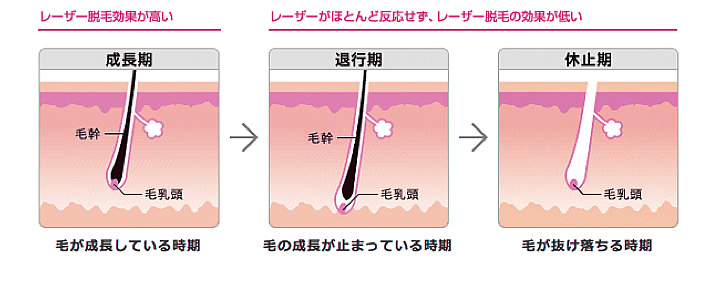毛が作られてすくすくと成長していく時期です。毛母細胞が活発になるため、このタイミングでレーザー照射を行なえば、毛乳頭に効果的に熱を伝えられ毛根組織の破壊が期待できます。