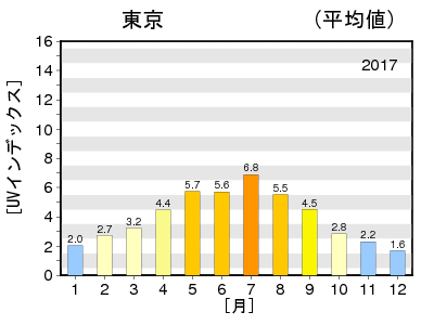 右図は気象庁のホームページより取得したもので、東京都のその日の「最大UVインデックス」を月別に平均化したグラフとなっています。 データは2017年の数値を引用していますが、ご覧のように夏は7月を中心に「紫外線量」が多いことが確認できます。