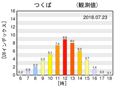 一年の中で最も暑さが厳しいとされるのは暦の上で「大暑(たいしょ)」と言われる日です。2018年に関しては7月23日(月)が大暑に当たり、東京都でも観測史上最高となる40.8℃が記録されたと報道されています。この日の「つくば市」の時間別の「UVインデックス」が左図です。ご覧のように正午の時点では8.9という非常に強い「UVインデックス」が記録されており、「外出を出来るだけ控えるべきレベル」に達していることがわかります。
