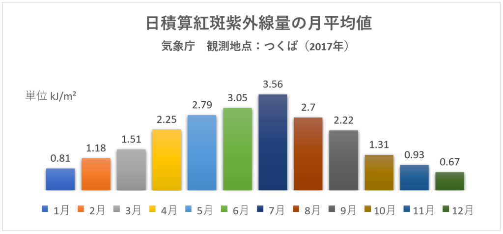 出典:気象庁(日積算紅斑紫外線量の月平均値の数値データ表) 気象庁のデータより作成した紫外線量の月別傾向(2017年のもの)と、レーザー脱毛の開始時期の適性表を重ね合わせれば、概ねなるほどとご納得いただけるのではないでしょうか。紫外線量として最も低くなるのが「冬」ですので、冬は施術後の肌トラブルを回避しやすく、この時期に大きな影響が生じやすい初回施術や2回目の施術を終わらせておくと安心できます。
