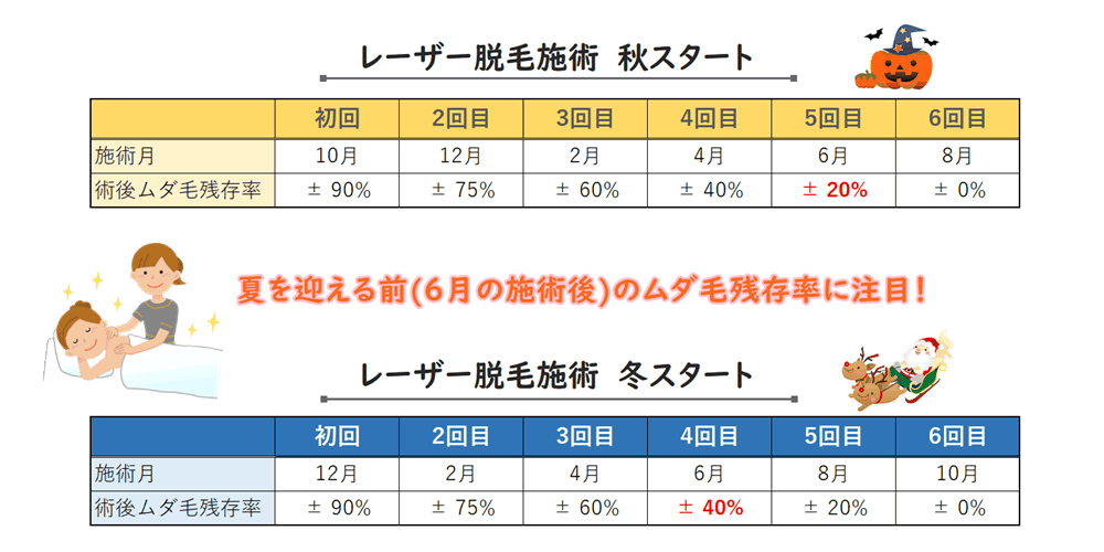 脱毛施術は…「秋スタート=最適」、「冬スタート=良好」!