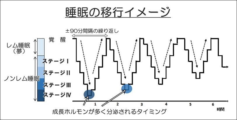 こうなると、次に眠りに落ちた時に「ステージⅢ」や「ステージⅣ」の領域に到達することができず、成長ホルモンがしっかりと分泌されないということが起こります。このため、ただたくさん眠れば良いということではなく、眠り初めの最初の3時間をいかに適切な環境で過ごすかが大切になってきます。