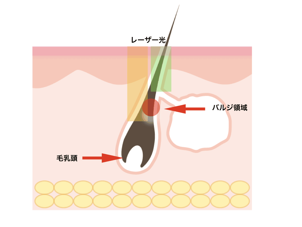 「メディオスターNext Pro」の特徴は、毛根内の「バルジ領域」という毛の成長を司る組織を破壊のターゲットとしているところです。これまで、毛の生成指令は毛根奥の「毛乳頭」を取り巻く「毛母細胞」でのみ行なわれているといった判断が主力であったため、毛根奥にまで熱エネルギーを届けるという脱毛施術が一般的でした。