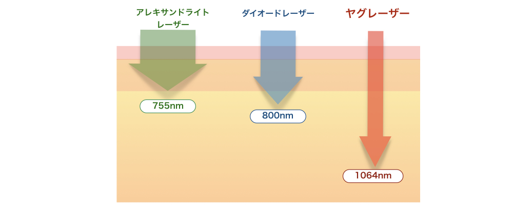 アレキサンドライトレーザー、ダイオードレーザー、YAGレーザーの各レーザーの特徴はレーザーの波長という点から捉えることができます。これによって「メラニン色素によく反応する・しない」といった特徴や、「毛根奥にまで届きやすい・届きにくい」といった傾向が出てきます。