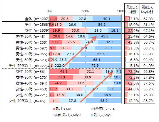 こちらの質問は、「自分のムダ毛を自分でどのように感じているか」という「自己意識」をまとめたものです。「年齢を重ねるほどにムダ毛意識は低くなる」というのが男女ともに共通した傾向だと読み取れます。結婚して子供ができ、子育てをしていく中で優先順位が自分から家族へとシフトしていくのは言わば自然な流れですので、この傾向自体は特に驚くことではないでしょう。