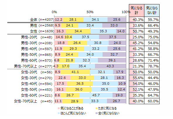 こちらは「異性のムダ毛についてどのように感じているのか」という「他者意識」がまとめられたものです。「女性が男性のムダ毛を気にしている割合」は、女性全体で見てみると50.7%という結果が出ています。