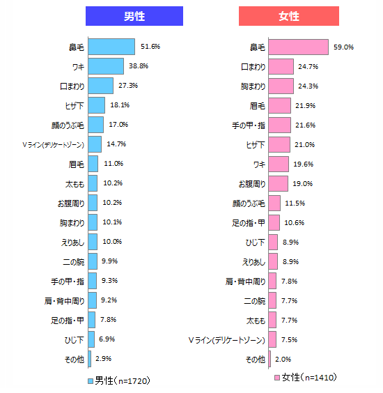 「鼻毛」の処理が身だしなみレベルの常識になっているところは男女間で違いがありませんが、 男性が女性の「ワキ毛」に目が行くことが多いのに対し、女性は「男性の口まわり(ヒゲ)」や「胸まわりの胸毛」、「眉毛」や「手の甲や指」、「ヒザ下」や「お腹周り」に多くの視線を寄せているのが興味深いです。