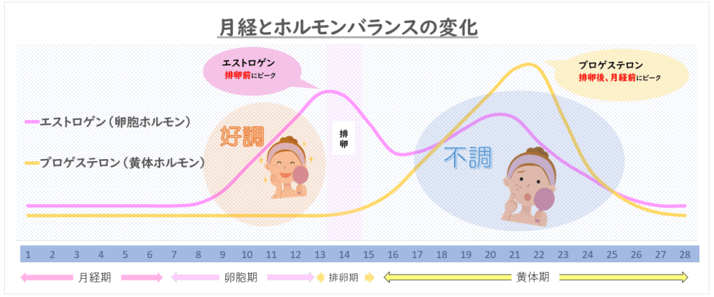 プロゲステロンが増加すると、「抗菌ペプチド」と呼ばれる物質が減少しお肌を守る機能が一時的に低下してしまいます。また皮脂の分泌量も増えるために、生理前には「吹き出物」や「肌荒れ」が生じやすいという影響が現れます。 レーザーを照射した場合に「痛みやすい…」と感じられるのは、このようなお肌のバリア機能の低下に因るものなのですが、ピルを服用したからといってこの種の影響が突出して現れるわけではございません。