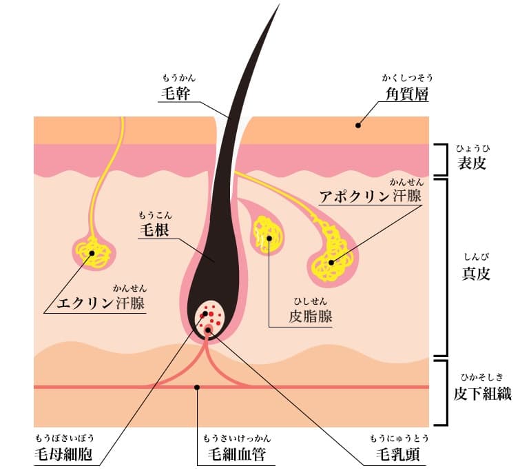 私たちのムダ毛は、毛根奥の「毛乳頭」を取り巻く「毛母細胞」の分裂によって成長します。「毛乳頭」は、毛細血管を通じて栄養素や酸素を吸収しており、これをエネルギー源にして「毛母細胞」を分裂させているのです。